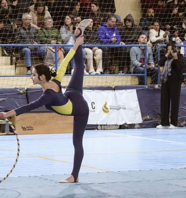 A ginástica rítmica é uma modalidade esportiva que combina movimentos corporais com elementos da dança, música e manipulação de aparelhos como fita, arco, bola, maças e corda.