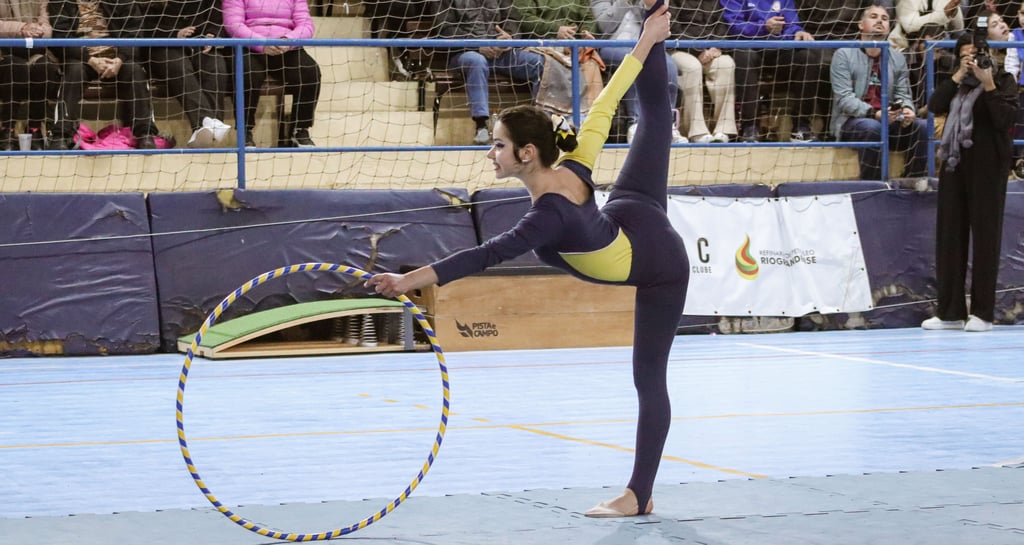 A ginástica rítmica é uma modalidade esportiva que combina movimentos corporais com elementos da dança, música e manipulação de aparelhos como fita, arco, bola, maças e corda.